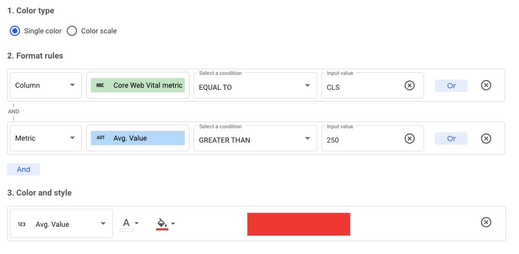 In order to make our pivot table a bit easier to scan, we added conditional formatting rules that will color our Core Web Vital values yellow or red if they fall under the “Needs Improvement” or “Poor” thresholds, respectively.