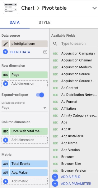 By using the “Core Web Vital metric” custom dimension we created in Step 1, we can get around this obstacle. Here’s how we set up the pivot table: