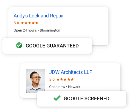 As a feature of the Local Service Ad, the service professional will be stamped with the ‘Google Guarantee’ or ‘Google Screened’ tag – a stamp accompanied by a green check awarded by Google. For service providers looking to stand out amongst the competition, a stamp from Google can instill trust with leads, potentially leading to higher customer conversions.