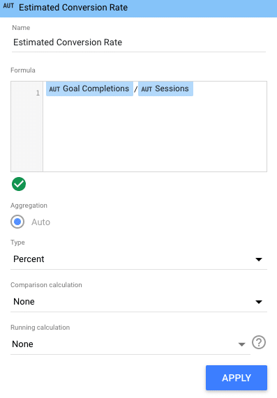 Using the dimensions and metrics available in your data source you can perform simple math functions. For example, if you wish to determine your estimated conversion rate, divide goal completions by total sessions.