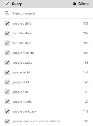 Tables are useful when you want to display multiple types of data. Tables allow users to look through each piece of data to understand overall progress and potential improvement areas. For example, using the example Google Search Console data, you can see data as it pertains to specific queries. This information can be useful when analyzing keyword performance, and interactions based on those keywords.